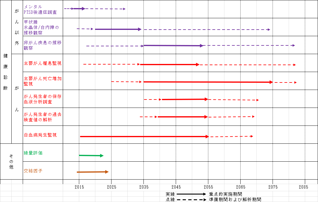 大震災と緊急作業における放射線被ばくの影響として、心理的影響や白血病など早期の変化が心配されます。甲状腺や白内障も比較的早期から問題になります。がん罹患は急性影響があれば被ばく後10年未満から増加する可能性があり、慢性影響は、その後30~40年は続く可能性があります。罹患された方々の生化学検査等が必要な場合に備え、血液・尿などの保存も行っています。この対象者集団の年齢構成を考慮すると、がんによって亡くなる方の割合が一般の方よりも多いかどうかの結論を出すには少なくとも40年以上の追跡調査が必要となります。
