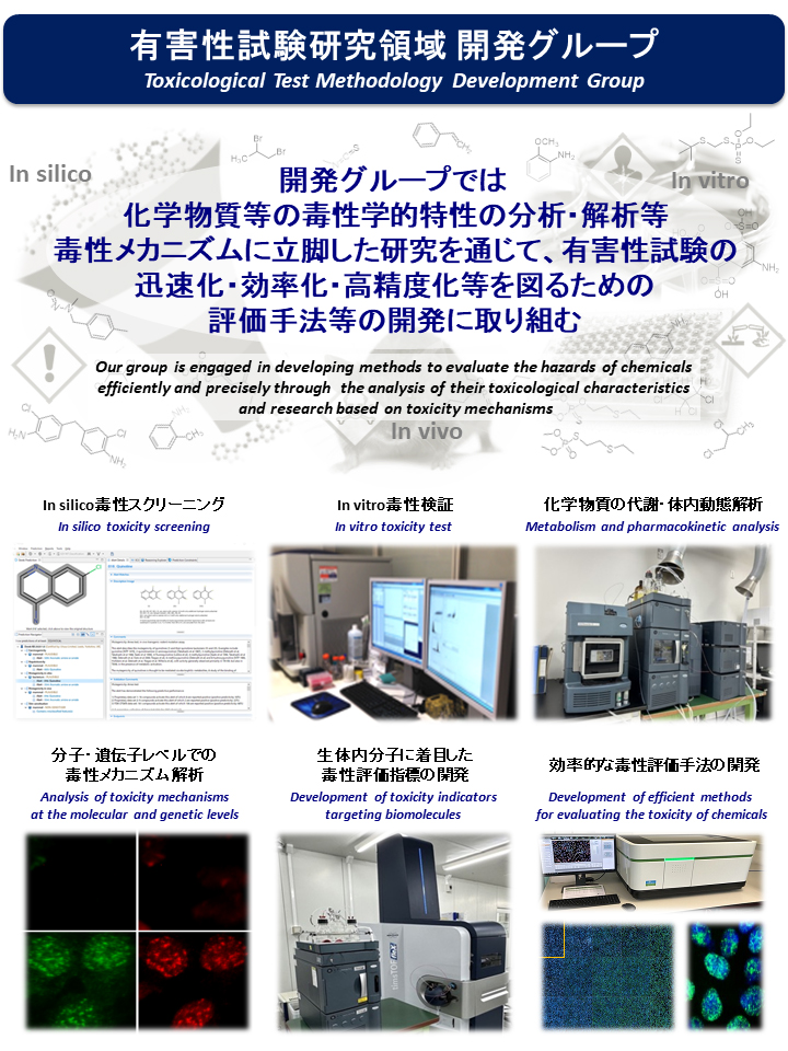 As the number of industrial chemical substances is rapidly increasing, new methods must be developed to efficiently and quickly characterize their toxicities. This group oversees research and development of new test methods.