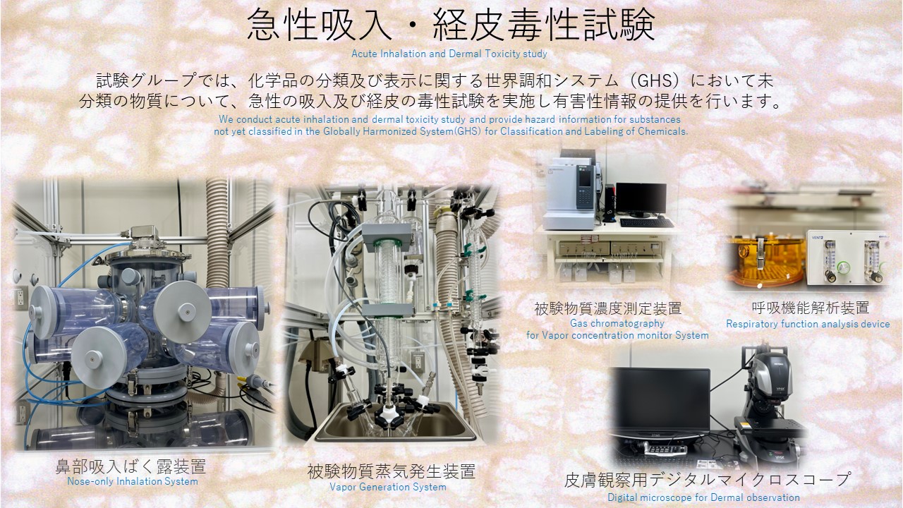 The testing group is responsible for conducting toxicity tests; they review the literature on hazardous industrial chemical substances, select substances to be tested, establish and manage standard test procedures (SOPs) for acute toxicity tests, and store test materials.