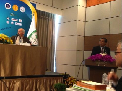 また、主催国のタイからは、タマサート大学公衆衛生学部長(元タイ国立労働条件・環境改善研究所長)のChaiyuth Chavalitnitikul博士が “Strengthen partnerships towards the global OSH Standards”(労働安全衛生の世界標準に向けた協力関係の強化)のタイトルで、タイの労働安全衛生状況を報告されました。タイでは2011年の労働安全衛生環境法に基づき、リスク・アセスメントが必須となり、労働安全衛生環境基金と労働安全衛生環境研究所が設立されることとなったこと、まもなく50人以上の企業ではOSHMS(労働安全衛生マネジメントシステム)が必須化されること、タイでの労働安全衛生上の課題は、非正規労働者の保護、移民労働者の保護、高齢労働者対策であること、移民労働者は労災保険でカバーされることとなったこと等についての発表でした。