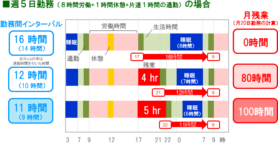 また、それを残業時間からみてみますと、勤務間インターバル12時間で1日4時間、インターバル11時間では1日5時間の残業時間となります。さらに、その残業時間を1カ月でみると、勤務間インターバルが12時間と11時間の場合は、月残業時間がそれぞれ80時間と100時間ということになり、往復の通勤時間を加算すればそれらは更に短くなります。