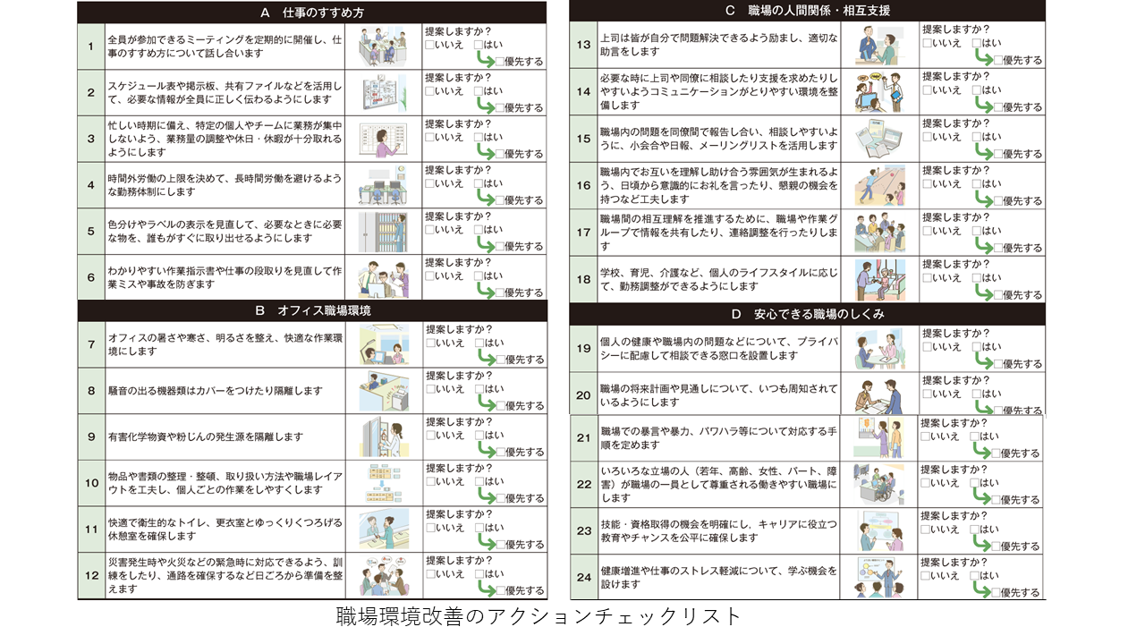 職場環境改善は、職場という場そのものをより安全で、健康的で、仕事がしやすい状態へ整えるための取り組みです。例えば、「いきいき職場づくりのための参加型職場環境改善の手引き」4)は従業員が主体となって行う職場環境改善の手引きであり、ストレスチェック制度と連動し、PDCAに沿って職場環境改善を進める方法や、従業員が24項目のチェックリストで職場を振り返る枠組みが示されています。24項目のチェックリストは、仕事のすすめ方の整備や物理的環境の改善、職場の人間関係・相互支援、相談窓口・教育研修に関するものが含まれています(図3)。